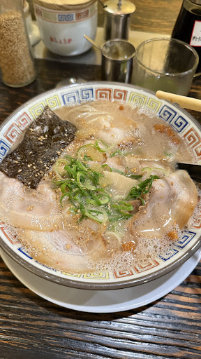 A local ramen shop serving up both modern and old school Hakata style ramen. You'll need to line up at the door if the restaurant is full and the staff will come out to ask you how many persons are in your party and will arrange accordingly. Once inside, you'll need to purchase your meal via the ticket vending machine first. Put the money in the machine, and select away. The tickets will be dispensed and you'll need to hand the tickets to the staff once you are seated. The place is cozy and has a bit of old Japan feel to it. The ramen comes out pretty quickly and that staff very friendly. One thing that stood out the most amongst the staff was that they provided individually packed hair ties for those with long hair; I thought they was great service on their part. The ramen was flavorful and I had the old style ramen, which included some fried lard as a topping. The gyoza were also delicious; bite sized and full on flavor. Don't the the smell upset you as the smell you smell in the restaurant is the fragrance that is a result of cooking pork bones for many hours to produces the rich soup. Overall, a great...