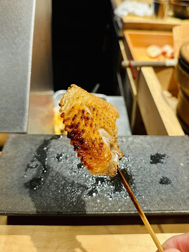 「鶏茶碗蒸し」「野菜スティック&ピクルス」を挟み串物スタート!さび焼きはしっとりと、胸肉は皮目パリッと美味い!中身はジューシーと上品な高坂鶏の味わいが滲み出てくる焼きも完璧です。
