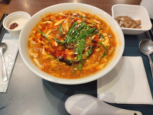 Read more店名は有名なはずですが、店構えがひっそりしているので、少しわかり難くこの辺に3年いて初めてランチで利用しました。 平日12時過ぎで3組(お一人様や2人連れが多い)待ちでしたが、回転が良いようで10分くらいで席へ通されすぐに酸辣湯麵をオーダーしました。 全体的に麻婆豆腐の注文が多いようで、ご飯、スープお替り無料なので次回は麻婆豆腐も良いなと思案していると、酸辣湯麵とご飯をオーダーしたはずが小チャーハンが来たのですが、お店側の間違いとの事で白ごはんにして貰いました。 酸辣湯麵は流石ホテル出身のシェフらしく辣油が香り高く、スープもしっかりしながら酸味、辛みのバランスが良く美味しかったです。(余談ですがホテル出身シェフは、麺類を安売りはせず千円以上を設定するけど品質とボリュームに転嫁する傾向が有る気がします。) 価格が1,200円と注文前は少々お高いと思いましたが、この美味しい麺類に自家製メンマ醤油煮にトロトロ杏仁豆腐、ご飯お替り無料なら妥当かなと認識が改まりました。 ただ、麻婆豆腐ランチは980円なのでやはりコスパはこちらの方が良いし、この価格にして熱々の土鍋で提供されるのは手間もかかっているなと感心しきりです。 担々麵ランチは1,300円とこれまた微妙にお高いけど絶対美味しいはずなので、暫くは...