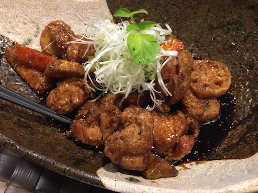 チキンフリット黒酢ソースは、イメージ通り とても美味しい料理でした✨😊 カリカリ食感でバルサミコと黒酢の甘酸っぱ さが、染み込んだチキンと蓮根や、人参や カボチャなどの野菜もありボリューム満点。
