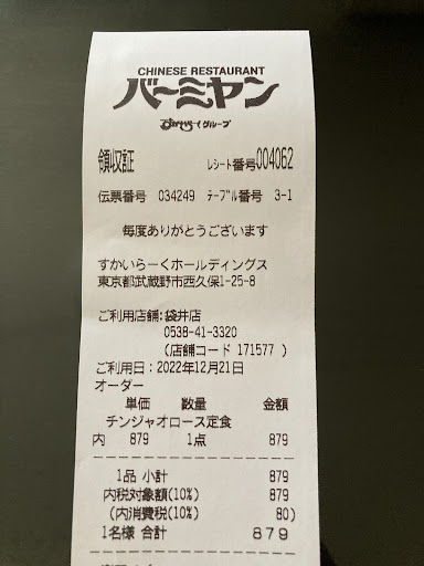 ラストオーダーが23時なので24時間営業の店より使い勝手が悪い。入ってすぐにアルコール消毒を強制的に求められるのは(ご協力をお願いしますとは言っているが)納得出来ない。アルコール過敏症の客の事を考えていない。アルコール以外も置くべきである。食事をしていない時(ただ話をしている時)、ドリンクバーを利用する時など、マスクをするように求められるのは対策として良いと思う。メニュー単品は安く感じるが税抜き表示であるし、セットで頼むので合計すると高めの値段と思う。食べきれない時は無料の容器に入れて持ち帰れるのが良い。ドリンクバーはココスの方が種類も多くもっと充実させて欲しいところだ。注文する前に必ずスカイラークアプリをダウンロードして、クーポンを確認して欲しい。食べたいメニューが例え20円でも割り引きになっているなら使うべきである。たまにもっとお得な割り引きメニューも有るので要確認で有る。中華のファミレスだが、しゃぶしゃぶの食べ放題が頼める(火鍋となっている)。平日17時以降の豚しゃぶなら1399円、通常で牛豚しゃぶが1699円、いずれも税抜き、時間100分(80分ラストオーダー)出汁は2種類選べる。餃子のをタレは専用の物を用意して欲しいものだ。醤油と酢を容器から、ラー油を袋を破って、タレを作るのだが美味しくはない。餃子がまずまずなので損している。メニュー全般不味いとは思わないが、平...