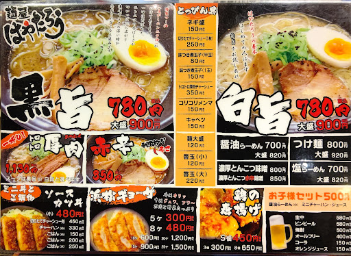 Read moreはやたろうの黒旨ラーメンイチオシです!!とんこつ系スープにマー油とにんにくがきいてて美味しいですが、その後お出掛けの方はちょっと控えた方がいいかもしれません(^^; オーソドックスなしょうゆ、みそ、塩どれも美味しいですしトッピングで色々楽しめます。 平日ランチセットはかなりお得❗ラーメンとご飯もの(ミニサイズ)セットで1000円しません!有料ですが更に麺大盛りも可能ですのでガッツリ食べたい方にもオススメです(^^) ただし餃子の焼き加減がバラバラで、先日注文した時は焼き色が薄く、皮同士ががくっついてしまっていて上手く取れませんでした。なので星はマイナス1。 平日休日問わず込み合いますが、回転も早いので少しなら待っていてもいいかなと思います。ただし子供連れにはあまり向かないです(メニューも店内も雰囲気も)。本当にラーメン食べてささっと出る、そんな感じです。スタッフさんは明るくて元気で優しいですよ!
