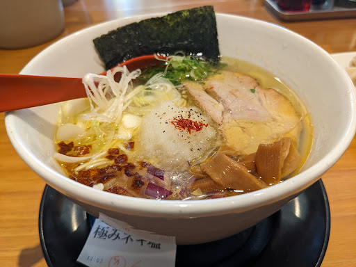 Read more2019.12.2 浜松で働いているため、袋井までの外回りのついでに、なかなか訪れる機会がないお店へ行きたいと思いお邪魔しました。 入口で女性店員さんが声を掛けてくれて、初めてと伝えるとお薦めのラーメンを紹介してくれたので、券売機で勧められた極みネギ塩ラーメン820円を注文。 平日昼のためか店内はかなり空きがあり長テーブル席の端に着席。店内は落ち着いたイメージのインテリアで、音楽も音量を押さえた適度な落ち着きが感じられました。 ほどなく提供されたラーメンは少し傾斜がキツく外周がやや小さな背の高い白い丼に入っていて、5種類のネギがトッピングされていました。真ん中のジェル状の物はタマネギの摺り下ろしだそうで、ニンニクかと思い提供してくれた店員さんに何か聞いてしまいました。5種類は青細ネギ、白長ネギ、紫玉ネギ、焦しネギ、タマネギの摺り下ろしでした。 味は全体的に優しい塩味で、円やかさと、それぞれのネギの特徴を楽しめました。麺は細麺でしっかり歯応えもあり、量も適度でした。食べ進めていくうちにスープに摺り下ろしたタマネギが溶け、焦しネギの香ばしさも加わり、とても美味しいスープになり飲み干してしまいました。 近くにあった...
