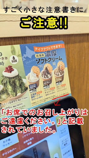 そのソフトクリームは店内で食べたらダメなメニューだそうで。 よく見ると、すごく小さな文字でその事が記載されていました。