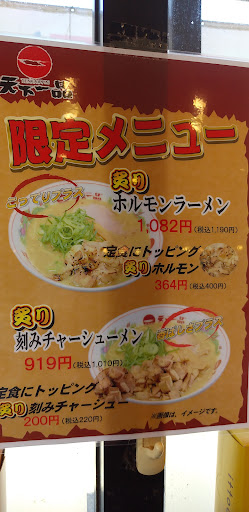 Read more久し振りに訪れました。 今回は天下一品祭りのさなか。 らーめんは裏切らない美味さ。 しかし、お会計の時に。 他の人には、アプリお持ちですかなど尋ねていましたが、 私には、何も無く、アプリありましたが、使うことも無く。 お店を出ました。 せっかくの天一祭りで来たのに、とても残念です。 何度か利用しています。 天下一品でも、スープは美味しい方だと思います。 久しぶりに訪れました。 高菜の食べ放題が有りました。 メニューは、豊富です。 店内は、かなり広くて、30人余裕で入れそうです。 今回は、スタンプがいっぱいになりましたので、 紫色の天下一品オリジナルのどんぶりミニ鉢をもらいました。 駐車場も広いです。 20台ぐらいは止められる。 感染対策もそれなりにされて、消毒液完備。 アクリル板の設置もしている。 いつもは混んでいます...
