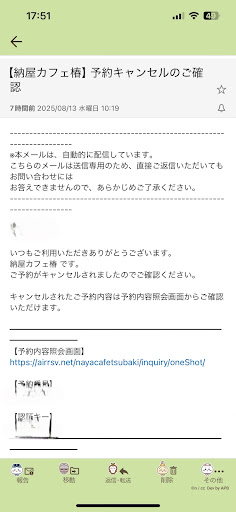 席の予約を事前にし、時間通りに来店したら若いスタッフの方に「本日は臨時休業です」と。 予約してるんですがと伝えると「オーナーから連絡入ってませんか?」と言われ、着信はなかったのでメールを開いてみたらキャンセル確認のメールが予約した時間の30分前に届いていました。 その場でそのメールをよく読まなかったのですが、よくよく文面を見ると「予約はキャンセルされました。」だけ。 何故キャンセルされたのか理由もお詫びも書いておらず、来店前にメールに気付いていてもなにかの間違いだと思い来店したと思います。 しかも文面の最後には「納屋カフェ椿です。この度はご予約ありがとうごさいます。皆様のご来店、心よりお待ちしております」と、、、。 予約の時に連絡のつく電話番号を提供しているのに、電話での対応が無かったことに憤りを感じました。 体調不良とか、食材の納品にミスがあったとか、設備トラブルとか、当日急に休業になってしまった点については仕方ない事なので理由がなんであろうとどうでもいいのですが、こんな対応で納得できるとでも思っていたのか、ものすごく残念です。 若いスタッフの方にお詫びに商品のクッキーを3種類差し上げますと言われ頂きましたが、私は口にしたくなかったので兄弟にあげました。 小さいお店ですし、予約が何十件と入っていて連絡が間に合わなかったとかは無いと思うので、もう少しお客さんを大切にして欲しいと思います。 お客様は神様とは思ってません。客もお店の方も平等な立場だと思います。 だからこそ今回の対応はすごく残念でした。 私はもう利用しませんが、他の方が同じ気持ちにならないように改め...