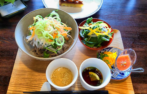 季節限定メニュー 野菜と蒸し鶏が乗った黒米平打ちパスタを ゴマだれ、レモンめんつゆで頂きます