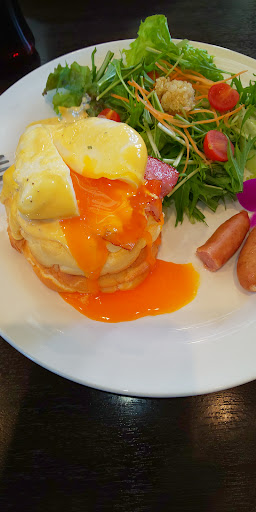 注文したパンケーキが到着♪な、なんと素敵なビジュアルに感動‼️ 崩して食べるのがもったいないって思うほど、どうやって食べようか迷いました♪ お食事パンケーキで甘くなく、ふわっふわでパンケーキの上にのっかった卵からはとろ~り流れる濃厚な黄身が、上品な手作りソースとパンケーキに混ざってびっくりする程最高に美味しかったです❗️