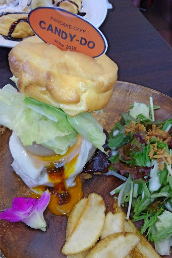 そんな訳で今日注文したのは 「CANDY・モコ」¥1480 フライドポテト、サラダ付き ハンバーグ、目玉焼き、オニオンステーキ、トマト、チーズをパンケーキで挟んだパンケーキロコモコ