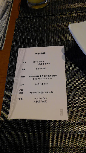 ◆四季会席 6300円+tax ・鶏肉のトマトクリーム煮、トマトクリームがまろやか♪ ・前菜 河豚の白子豆腐 白子は、あまり好きじゃあないのに、何故か❗美味しいお豆腐。秋刀魚の南蛮漬け くるくる巻き巻き真ん中にはごぼう、ピリッと南蛮漬け ・刺身 でっかい海老、甘ぁ~い❤️イクラを乗せた厚みのあるホタテ、サーモンも良いね ・蒸物 菊と海老の茶碗蒸し ・揚げ物 海老芋と蕎麦の実のおかき揚げ 芋海老芋の中には、ブラックタイガーなど海老がいっぱい。おかきを細かくした衣です。 ・主皿 牛肉“アウトサイドスカート”のソテー 山葵とお塩でいただきます。山葵とハラミ、愛ますね♪ ・ご飯 汁物 お米は、コシヒカリ100% ・甘味 さつまいものプリン、八夢茶(抹茶)、最後には、ほうじ茶も……