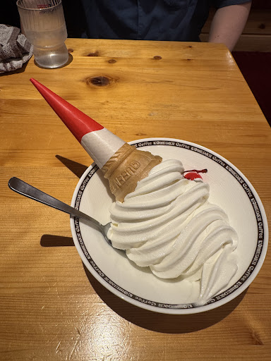 先にソフトクリームが来たwww 喫茶店だからファミレスみたいな後出しオペレーションじゃないのね、完全に油断してました(反省) さてこのソフトクリーム、味は正統派の昔ながら。だが量がスゴイ。 一般的なソフトの1.5倍はありそうなビッグサイズ。 このやりすぎ感こそ、まさにコメダの矜持。