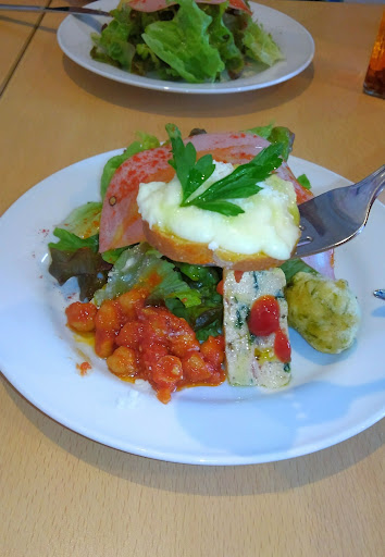 前菜サラダにはスパイスの利いたハムに たっぷりサラダ、スパニッシュオムレツ ヒヨコ豆のトマト煮など6品 どれも美味しいです✨