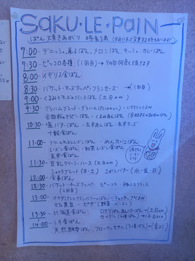 Read more朝の7時からオープンするパン屋さん。 朝とはいえたくさんのパンが並んでいます。 時間によって焼き上がりのパンが違いますが、店内に焼き上げ表が貼ってあります。 その写真も追加しました。