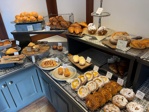 お店の外観はとてもおしゃれで、イングリッシュガーデンを感じる緑の多い雰囲気です✨ 店内に入るとまず焼きたてのパンの香ばしい、そしてほんのり甘い香りに包まれます。 目の前にはパンがずらり!プレートを取ってセルフで好きなパンを選んでいきます。レジの左手奥にはイートインコーナーで2〜4人掛けのテーブル席が5つほど。カウンター席もあるようでした。