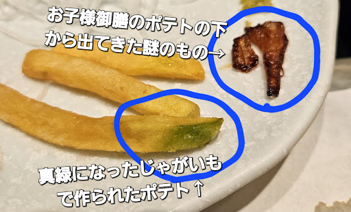 出てきてビックリ、小さな子供が食べるお子様セットのフライドポテトは真緑になっていました。(写真参照)