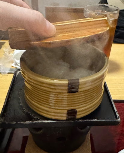 甘めの切干大根の小鉢 茶碗蒸しは椎茸、銀杏ら海老など盛りだくさん イカシュウマイは 熱々をいただけるよう点火いただいた どれも美味しい