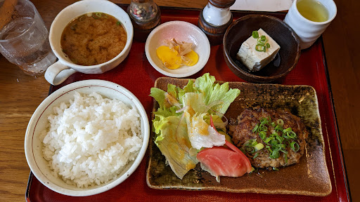 ハンバーグが美味しいと評判のお店。ワタシは150gのハンバーグランチ(ポン酢おろしソース880円)、友人は生姜焼ランチを注文です。ここのハンバーグの美点は、①肉は牛肉と豚肉の合挽き。②肉の食感を味わえる粗挽き。これがまともなハンバーグで美味しい。デミグラスソースは濃すぎて肉の味がわからなくなるので、和風のポン酢にしました。大正解です! 最近は100%ビーフを謳う店がおおいですが、安い牛の脂肪分でつないでいて、脂っぽいだけのことが多いです。