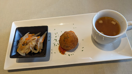 ライスコロッケ 外はカリカリ、中はご飯粒がねっとりと、さわやかなトマトソースで美味しいです😋なかは熱々なので要注意⚠