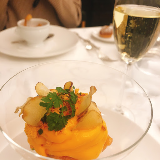 が、結局ソースがマンゴーとオレンジ?のソースでした。 ソースを食べてしまった後に、店員さんに「これはなんのソースですか?」と確認したら、少しお待ちくださいと厨房に行き、シェフに確認。 その時の厨房での話し声は丸聞こえで、シェフの言葉からマンゴーという言葉も出てきました。 でも店員さんは私達の席に戻ってきて、果物は入っていませんと言われました。 「この黄色いソースはなんですか?」ともう一度尋ねると、もう一度確認してきますと、また厨房に行き、戻ってきて「マンゴーでした」と言われました。