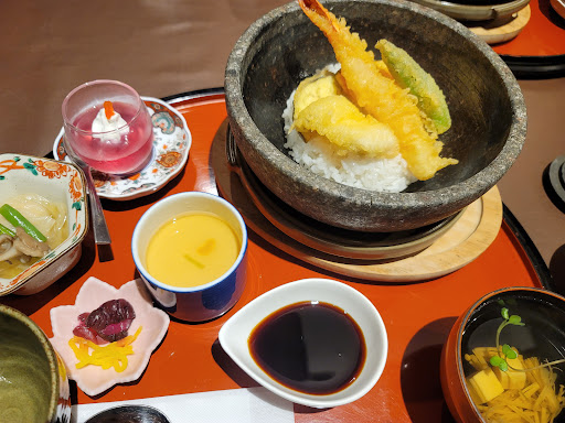 Read more1,500円からの定食が充実。 石焼き天ぷら丼の定食を注文。 熱々の器にサクサクの天ぷら、好みの量のタレをかけて、ジュージュー混ぜ混ぜ。 茶碗蒸しもツルっとしていて、そしてちゃんと銀杏が入って美味しかったです。