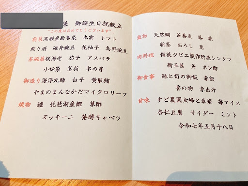 先日、両家の顔合わせで利用させて頂きました。 コースの内容は、ぶどうの前菜、酢の物、炊合せ、天然鯛と金目鯛のお刺身、鮎とタチウオの南蛮漬け、とうもろこしご飯、味噌汁、漬物、わらび餅とプリンのデザートなど、どれも大変美味しく、器も素敵で見た目も上品でした。