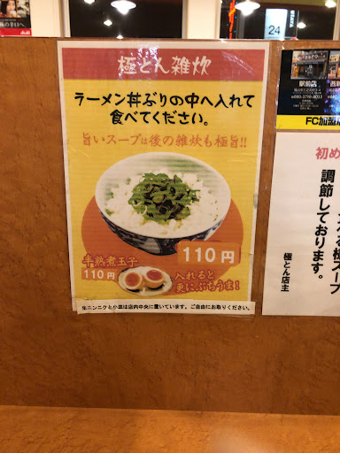 ◎良い点 ⚫︎深夜23:00まで営業 ⚫︎安心のチェーン店 ⚫︎替玉100円 ⚫︎プラス110円で雑炊 (これはいい!) ⚫︎高菜と相性が良いスープ。豚骨。 ⚫︎駐車場が広い。 ⚫︎定食が1000円以内で食べれる。