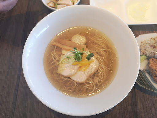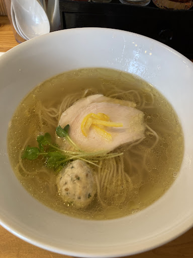 Read more汁は見た目さっぱり、あっさり。濃いめの塩味。なのだけど、魚介風味があり楽しめる。 鶏チャーシューは柔らかな食感で2枚がちょうど良い。 つくねは弾力がありすぎて少し硬いかなと思うので私好みではなかったが、子供が欲しがってはいたので好みの違いかと。 麺大盛りは100円プラス 替え玉は150円プラスなので、最初から大盛り頼んでおけばよかったかなと思うほど。 鶏そばに刻んだ玉ねぎと生姜、柚子胡椒がついていて、テーブルには、こしょう、にんにく辣油、バルサミコ酢、オリーブオイルと味変が多彩。飽きがこないような工夫をされている。 しかし、汁自体美味しいのでここまで味変種類を増やさなくてもいいのではないかなとも思う。