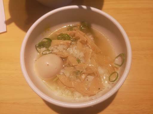 見るからにしてパサついてて、実際食べてみるとべちゃっと糊みたいな感じになるわで米を食べた気がしなかった。 新メニューで、〆のリゾットと書かれたPOPがあったが、リゾット用のご飯を出されたのかと言う感じ。確かに、スープを浸せば食べれなくもない感じやったが、ライスが不味いラーメン屋は初めて。 狙ってやった炊き方なのか、たまたま失敗したのかわ判らないが、ご飯系を注文されるかたは気を付けた方が良いと思われる。 どうしても頼みたいかたは、リゾットにするつもりでいた方が幸せかもしれない。