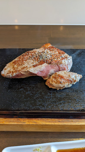April 8 追加:本日はサーロインを食べてみました。200gが税込1600円です。3センチ以上厚みがある塊で出ます。ステーキらしくていいですね。レアで出ますから、カットして溶岩プレートでお好みの焼き加減にできます。かなり保熱してますから焼きすぎに注意!