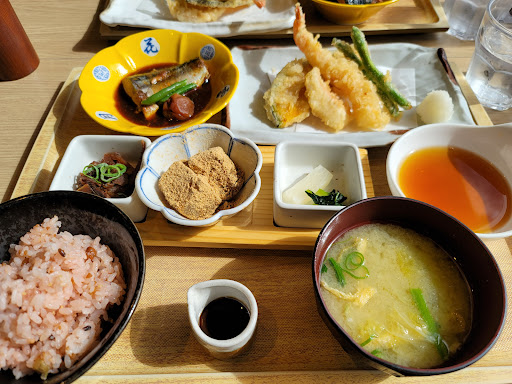 Read moreはじめて行きました。いつもランチ☀️🍴時には⤴️⤴️ウエイテイングです。 やっと11時前に名前を書いて、少し早めのランチ☀️🍴を頂きました✨ 豚🐷蒸ししゃぶ野菜、天ぷら、味噌汁、五穀ご飯、漬物のセットメニューにしました。 天ぷらは揚げたて、蒸ししゃぶのじゃがいもは熱々ホクホク‼️どれも美味しかったです。 お子さまランチ☀️🍴も、おすすめのわらび餅、かき氷🍧も、ドリンクバーもありました。 店内に入ったら和の空間が広がり、スタッフの方の元気な声が心地よく、店内の座席💺はプライバシーが守れてました。 料理を配膳してくれた女性スタッフの方が食べ方の説明をしてくれました。熱いお茶もさりげなく持って来てくれました。さりげないサービスは素敵ですね。ゆっくり食事を楽しめました。 今度はデザートも食べてみたいです。 ご飯はお...