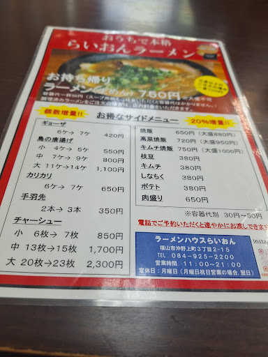 Read more今日のランチは、こちら。 福山市で30年以上営業されている老舗の町中華ラーメン屋『らいおんラーメン』さんです。 前から看板気になっていたので、思い切って入りました。 店内は、13時でも満席状態でした。 常連さんがたくさんいるのでしょう。カウンターのスタッフさんが忙しく厨房から料理を受け渡す隣に案内された。 このカウンターの場所最悪なんだけど…(笑) セット料金もちょっと高い。 ラーメン単品980円位+セット400円からいろいろ。 ラーメンの麺量は少なめです、 私は大辛ラーメンのセット。 お連れさんは、塩バターラーメンセットです。 単品で炒飯も注文。 さて、いただきますが… アレ??アレレレ〜泣 ラーメンがめっちゃぬるい🍜🍜🍜 ふーふーしなくても食えるというか まったく熱くないラーメン🍜でした。 お連れさんのバターが溶けるか心配なくらいです。 最近2人で行くとカウンターに通される。厨房の中が見えてしまって、ちょっと困る・・・ ラーメンだけじゃなくて、から揚げもちょっとなあー。カラッと揚がってないしっとりタイプのから揚げ。 接客対応しているスタッフのおばちゃんは、 会計でお金触った手も洗わず、素手で次のお客様のレンゲなどをそのままセットしているのはちょっと頂けない。