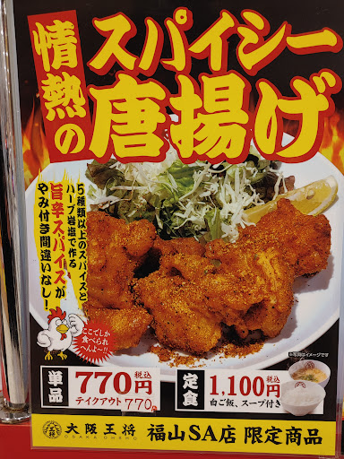 Read moreいつもは、京都王将に行きますが、ここの餃子だけは、おいしいんです。『餃子W定食』を食べます。ちょっと焼きすぎぐらいに、焼いてくれてるのが、パリパリで好きです。以前は、付け合わせに小さいレタスサラダが付いてましたが、最近は、もやしのぽん酢あえみたいなのが付いてます。ちょっと残念ですが、餃子おいしいから良いんですよ。焦げ過ぎ手前ぐらい、しっかり焼いてくださいね。また、食べに行きます。福山のサービスエリアは、上下とも外から中に歩いて入れるので良く利用してます。裏に、従業員・お客様駐車場があります。高速道路のサービスエリアって、プチ旅行した...