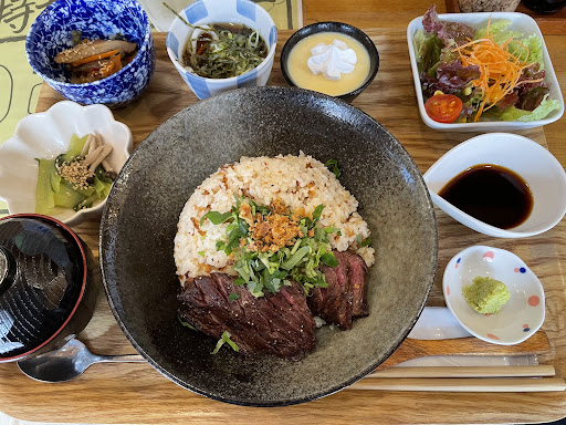 Read more価格が1000円以上でセットともなると2000円くらいするのに、メニュー表に写真や説明がないから、ダブルステーキとコンボステーキ?何が違うんだ?となるし、いちいち店員さんに聞くのも好きじゃないからめんどくさくなる。ステーキ丼セット2000円くらいを頼んだけど、謎にうどんがついてきた。 ステーキ丼は米が、うーん300gくらいはあるね?しかもフライドオニオンみたいなのと炒めてあるからヘビー過ぎて、サラリーマンですらセットにしない理由がやっと分かった。上に乗ってる肉は値段払う割には少ないと感じたし、脂っこくないけど安っぽい肉だった。ばあちゃんが作ったきんぴらみたいなのと、フリルレタスのサラダは普通に美味しかったけど、しめじと小松菜の和え物は何の味もなかった。