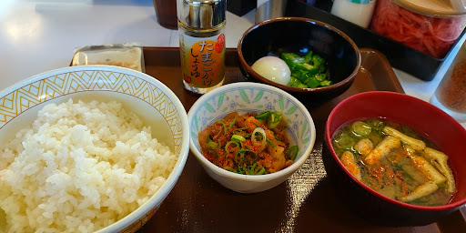 2022/7/30追加: 牛丼チェーンの○屋の朝食が期待以上に良かったので、こちらの朝食もトライすることに。鮭朝定食プラス生卵で460円。鮭もケチってないし、突き合せのヒジキも健康志向でよい。味噌汁も具が沢山入ってる。特筆すべきは味付け海苔。3枚しか入ってませんが、ちゃんとした品質なのには驚いた(○屋のは最低レベル)。鮭朝定としては総合的にみてこちらに軍配が上がりますね。11時までサービスしてるから早めのランチにいいかも!