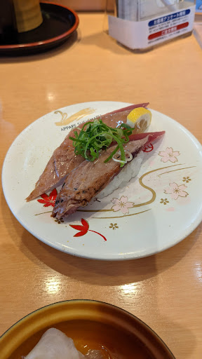 ここは地元資本のチェーン店で、地元のネタが多いのがいいですね。美味しいチイチイイカが120円の赤皿で食べられました!
