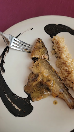 「鮎のコンフィ。白ワイン、マッシュルーム、大葉、イカ墨のソースにリゾット」