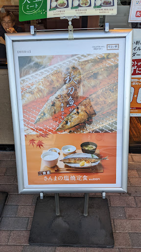 2022/9/5 店頭のキャンペーンポスターがサンマ定食(¥890)でした。今年は大変な不漁だそうなので、食べたくなりました! 三陸産のサンマだそうですが、ごく普通のスマートな体型です。特筆すべきは焼き加減が良くて、全く焦がしてません。鮮度のよいサンマは皮も内蔵も美味しいのですが、出されたサンマは身肉は勿論皮も美味しい。内蔵も苦味があって美味しいのですが、ちょっとだけにして残しました(アレはいませんでしたけど)。締めは最近お店が薦めている「出汁茶漬け」を作ってみました。アッサリした出汁ですが、これならこれまで通りの「ほうじ茶の茶漬け」のほうがサッパリしてよいと思いました。