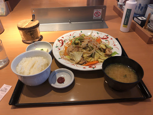 定食チェーン店です。品数は多いですが、基本的にどれも味付けが濃いのが難点。貝汁(アサリの味噌汁)が好きなのですが、この店のは辛すぎて、腎臓病になりそう(笑)。で、ワタシがこの店で食べるのは肉野菜炒め定食(690円)です。味付けはやっぱり塩辛いですが何とか我慢できる範囲です。火力の強い鍋で炒めてあるのがよいです。豚肉の他に色々な野菜も入っています。ご飯のおかわりと刻み沢庵が食べ放題(?)なので、いつも締めに、ご飯にほうじ茶をかけてお茶漬けを食べています。これが出来るのがここに時々くる理由かも!