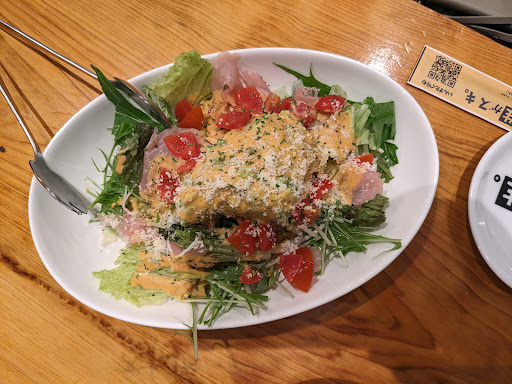 ドアが開くと店内。右窓側はローソファが二卓、すぐ左は二人がけテーブル席5卓、四人席か2卓。厨房前カウンターは5席くらい。厨房横を奥に入ると4〜6人グループ席が2卓、更に奥には二人席3卓にテーブル座敷が8卓(宴会可能な広間)といった感じで意外にキャパがありました。 着席すると2時間以内でラストオーダーは飲食共に1時間半後と伝えられます。飲み放題もあるが、ここはドリンクは単品で。QRコードのオーダーだがWifiが無い。このシステムを使うならWifi必須で設置して使わせてもらいたい。 近くの席に喫煙者が居ると周囲は全てタバコのニオイと煙が立ち込めます。分煙は無し。これは少し気になった。