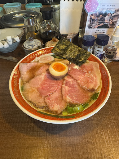 Read more20221009 二日酔気味で出汁が効いたあっさり系を食べたくて訪問。 11時10分頃に着くと空き3席ですぐに入れました。 注文したのは潮彩らーめん、麺硬めです。 5分程で着丼。 まずはスープを1口。 うん、やっぱりここは出汁をしっかりひけてますね。 塩もがっつりではなく優しい味付けです。 二日酔でも大丈夫(笑) 意外と胡椒が効いてます。 チャーシューは2種類。 肉の匂いがして噛むと煮込まれた味が出てくるのと、さっぱり系だけど噛んだときに肉汁が出てくるやつ。 後者のが好みでしたが、どちらも美味しいですね。 玉子は味付けがほぼなくて黄身の味が濃かった。 何気にメンマも美味しい。 ネギを巻き込みつつ麺をズルット啜って、スープを飲み過ぎたところで完食。 細かく切ってある紫玉ねぎもアクセントで良かったなぁ。 ご馳走様でした。