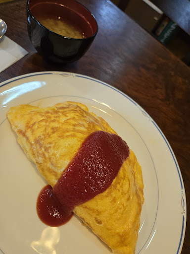 Read moreドアを開けてすぐにタバコの臭いがしました。各席に灰皿がありますのでその点を理解してからの入店をおすすめします。 オムライスを注文。フランクなオカミさんがてきぱき動き、ほぼ9割りくらい常連さんだと思われます。オムライスは卵で包む昔ながらのタイプと最近のふわふわも選択できる模様。せっかくのレトロ喫茶店ですから包むタイプで。 チキンライスの味付けはナポリタンと同じらしいですが、少し辛みを感じるけど辛いのが苦手でも美味しく食べられるレベル。ハムと玉ねぎ入り(あ、チキンじゃないな😆) サラダと味噌汁、飲み物(コーヒー、紅茶。オレンジジュースのいずれか)つきで1050円(税込) 日常使いのお店らしくテレビもずっと音声つきです。 私はタバコがダメなのでそこはマイ...