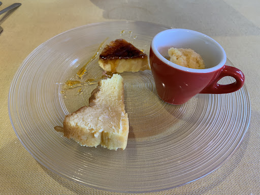 パスタは3種類から選べ、エビとほうれん草のクリームパスタにしました。クリームがコク深く、少し太めの麺とよくマッチしていると思いました。 食後のデザートは、選べる3種盛り。カタラーナ、焼き菓子、黄桃のシャーベットにしました。700円くらい? 果実感のあるシャーベットが好印象でした。