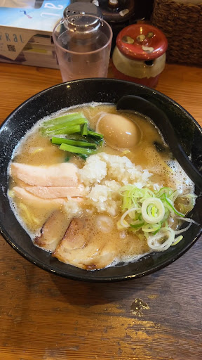 スープはブタがらや背脂、野菜から旨味が出ているような味。野菜の甘さがスープに溶け出していて、何とも甘めの優しい味が寒い体を温めてくれる。 そして乳化した濁り濃厚スープが、硬めの太麺とよく絡み合いマッチしていて美味しい。 麺もコシがあってボリュームがあり、男性でも十分に満足できる量だろう。 食べていると特にすりおろし玉ねぎとニンニクの味が印象に残った。 チャーシューはペラペラであまり期待出来ないだろう。