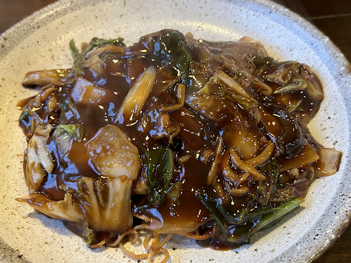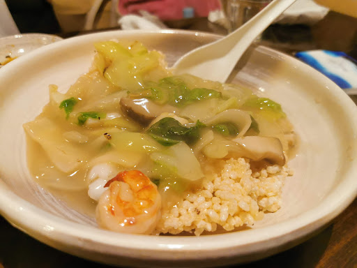 さらに10分ほどして五目あんかけ焼きそばがやって来ました。 餡の色は黒に近い焦げ茶色でした。焼きそばは硬めで長崎の皿うどんのようなそばでした。 私は醤油寄りの餡よりも、もう少し塩味の効いた餡が好みなので、(実物は見ていませんが)海鮮あんかけそばの方が合っていたかもなと思いました。