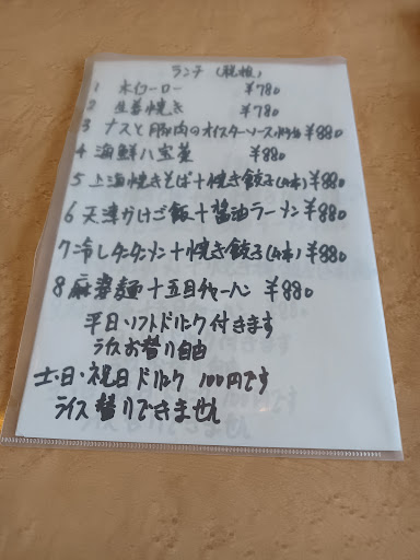 評判の良い大陸系中華料理店に平日の13時前に行ってきました。 駐車場は店舗裏にある2〜11番までがこちらのお店の契約駐車場らしいです。どこにも明示されてはいなかったようですので、店員さんに聞いて教えてもらいました。 正直、とても分かりにくいです。 行列することなく、すぐに入ることが出来ましたが、店内はほとんど満席となっており、期待通りの人気店のようです。ガス会社の服を着た方が入れ替わり立ち替わりで入ってきたので、よほど社内で流行っているのでしょう。 さて、料理はこの手のランチメニューには珍しい酸辣湯麺があったので、エビレタス炒飯との定食(ドリンク付)を選択。 日替わりメニュー(ドリンク付)にあった冷やし坦々麺と餃子セットに同行者は惹かれたのですが、辛さは調節できないとのことで、泣く泣く冷やし中華単品を選択。 待つこと5分程度で酸辣湯麺が着丼。とても早いです。取り分け用の小皿とザーサイとキムチの切れ端が乗った小鉢と杏仁豆腐も一緒でした。 味は特段辛くも酸っぱくもありませんが、餡には柔らかい豚肉とニラ、豆腐、筍、ネギ、トマトが入っていて熱々でした。ストレート細麺と頂きます。麺に餡が良く絡んで、なかなかでした。 醤油味の冷やし中華は更に5分後位で着丼。 具は焼豚と蒸し鶏、くらげ、煮卵、カニカマ、レタス、きゅうりが乗っていました。 一口もらいましたが、だいぶ醤油だれの味が濃いようで、最後の方は舌がやられます。 ところで、酸辣湯麺も冷やし中華も食べ終わっても、セットのドリンクも炒飯も来ません。 食べ終わってから、10分経っても来ません…。混んでいるし、しょうがないよね。待っている間にお腹膨れてしまうなぁとか考えていたところ、10分以上後から入ったお客さんのセット炒飯より遅れて、漸く持ってきてくれました。 その際に店員さんにドリンクがまだ届いていないことを伝えるも、これがまた全然来ず…。 結局、炒飯が食べ終わってから、再度呼ぶ羽目に。この頃にはお客さんも空き始めていたことを考えると、とても残念でした。 なお、海老レタス炒飯の味は卵の殻が入っていたのか、化学調味料が固まっていたのか分かりませんが、ジャリジャリとした食感が炒飯全体にあった時点でナニコレ状態。 食べ終わってから、暫くは舌が痺れるほど化学調味料味が強かった上に、お米も固い。 この味がデフォルトなの?レタスも殆ど入っていないし、自分で作った方が美味しく作れそう。作るの忘れて、焦って作ったの? コスパは否定しませんが、ボリュームと味、なにより料理提供のサービスなどを考えると、もう行かないでしょう。 行きつけの大陸系中華料理(船橋市駿河台2丁目)と比べるレベ...