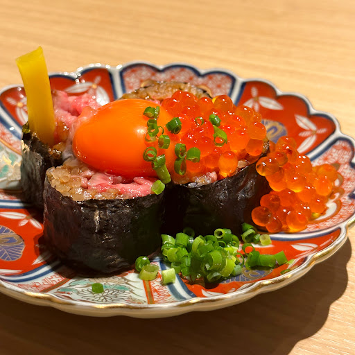 お肉とたくあんを炊き立ての銀シャリで包み 卵黄にいくらをたっぷりかけた映えすぎる巻き寿司。