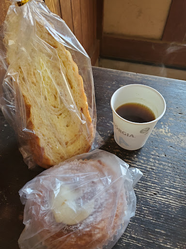 パンを購入すると、コーヒーサービスがあります。駐車場の脇に、テーブルとイスがありそこで食べれます。暖かくなると虫もよくいますが。