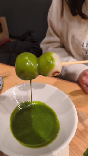 ・抹茶の団子フォンデュは もちもちのお団子を 抹茶のソースにディップ。