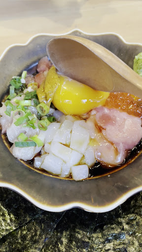 マグロ、イカ、雲丹、いくら、ネギトロ 長芋、納豆、オクラなど色々入っとる。