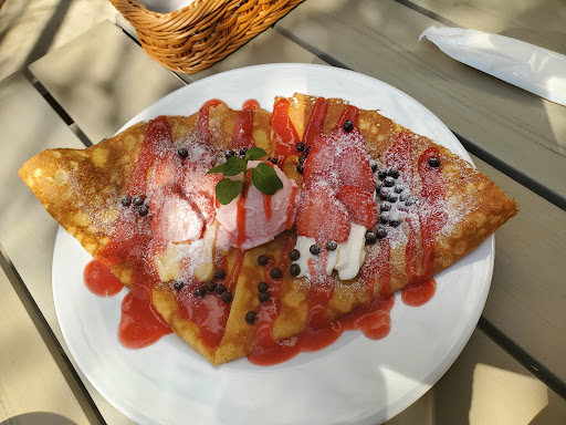 スープ、お食事ガレット、クレープ、ドリンクがつくフルセットを2名でそれぞれ注文。 サワークリームがのったボルシチもとても美味しかったし、シーフードグラタンのガレットも鴨肉の低温ローストとサラダのガレットも美味しかった! クレープはキャラメルりんごも美味だったし、連れはチョコソースのクレープにアイスと焼きバナナをトッピングしたのを注文しましたが、こちらも王道の美味しさでした。